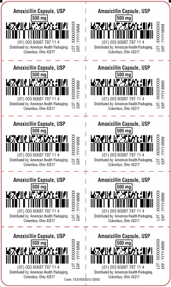 This is a product description for Amoxicillin Capsules, USP with 100 capsules (10 x 10) containing 500mg as the trihydrate in each capsule. The dosage information should be checked from the prescribing information provided. The storage instructions recommend storing at 20° to 25°C (68° to 77°F) with excursions permitted to 15° to 30°C (59° to 86°F). It is important to not use if the blister is torn or broken. The packaging includes a warning to keep all drugs out of the reach of children. The product is distributed by American Health Packaging in Columbus, Ohio, and is manufactured in India. For further information, visit the American Health Packaging website.*