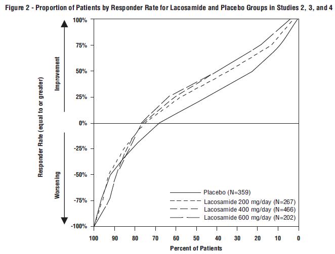 - Figure 2 - Proportion of patients by Responder Rate for Lacosamide and Placebo Groups in Studies 2, 3, and 4 - lacosamide fig2