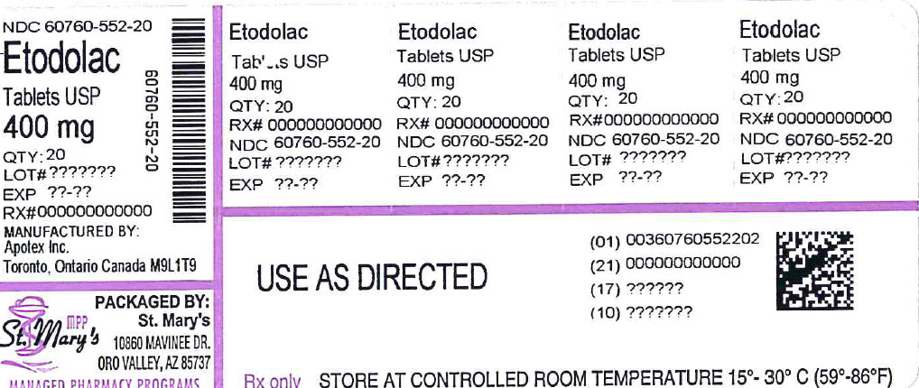 The following 2 images provide visual information about the product associated with Etodolac NDC 60760-552 by St. Mary�s Medical Park Pharmacy, such as packaging, labeling, and the appearance of the drug itself. This resource could be helpful for medical professionals, pharmacists, and patients seeking to verify medication information and ensure they have the correct product.