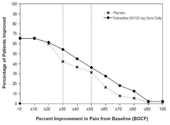 The graph shows the percentage of patients who improved with Duloxetine medication compared to a placebo. The improvement is measured in terms of pain relief from baseline and ranges from 0% to 100%. The x-axis shows the range of pain relief percentage while the y-axis represents the frequency or number of patients. The graph suggests that patients who took Duloxetine experienced significant improvement in pain compared to the placebo.*