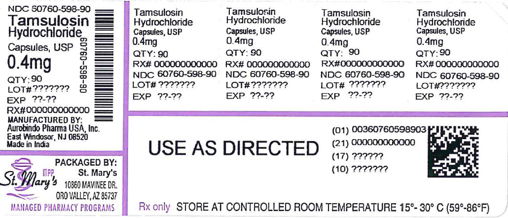 This is a description of Tamsulosin Hydrochloride Capsules, USP 0.4mg. The bottle contains 90 capsules with the NDC code 60760-598-90, Lot number 222277?, and expiration date 72-77. The medication is manufactured by Aurobindo Pharma USA, located at East Windosor in NJ, made in India. The label also provides directions for use and storage temperature recommendations.*