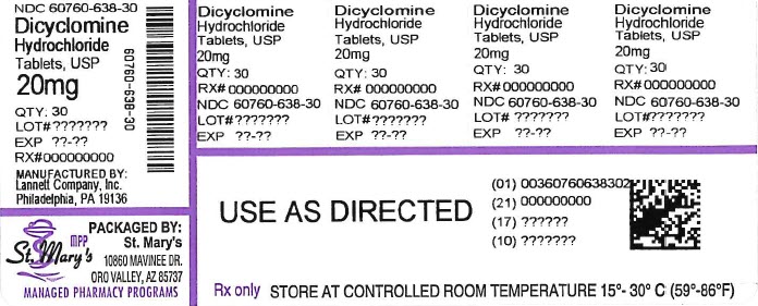 The following 2 images provide visual information about the product associated with Dicyclomine Hydrochloride NDC 60760-638 by St Mary's Medical Park Pharmacy, such as packaging, labeling, and the appearance of the drug itself. This resource could be helpful for medical professionals, pharmacists, and patients seeking to verify medication information and ensure they have the correct product.