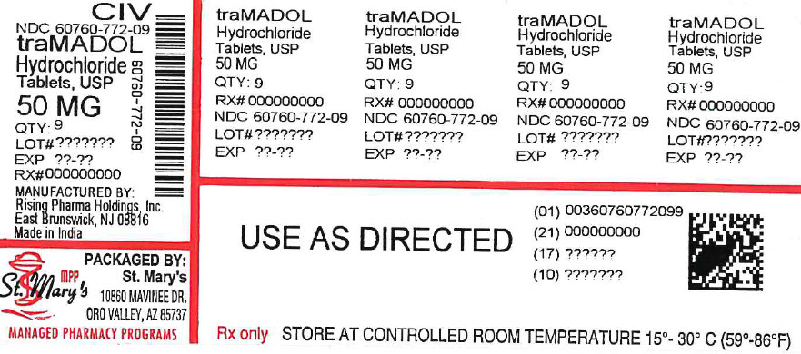 This is a label of a bottle of Tramadol Hydrochloride Tablets, USP. The tablets are 50 MG each and the bottle contains 9 tablets. It was manufactured by Rising Pharma Holdings in India and packaged in Oro Valley, Arizona, USA. It has an NDC number of 60760-772-09 and the lot number is 777227. The expiry date is 22-77 and it should be stored at controlled room temperature between 15°C to 30°C (59°F to 86°F). It also provides information on how to use it and a contact number.*