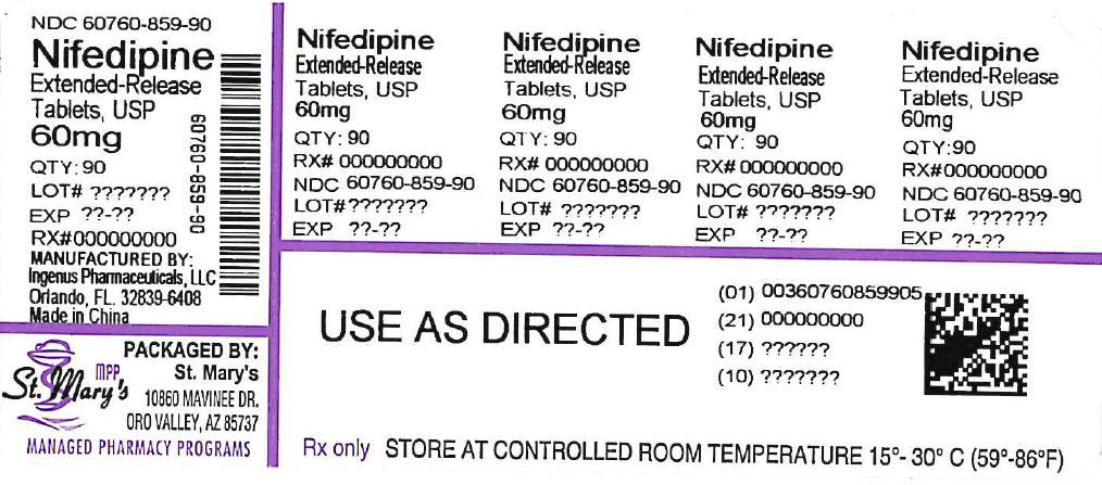 The following 5 images provide visual information about the product associated with Nifedipine NDC 60760-859 by St. Mary's Medical Park Pharmacy, such as packaging, labeling, and the appearance of the drug itself. This resource could be helpful for medical professionals, pharmacists, and patients seeking to verify medication information and ensure they have the correct product.
