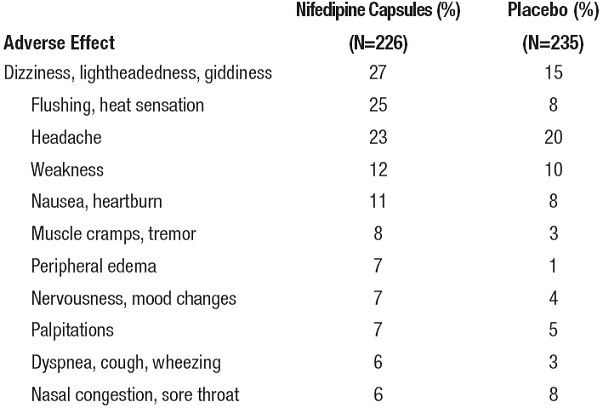 This table presents the comparison of adverse effects experienced by individuals taking nifedipine capsules versus those who took a placebo. The total number of participants in each group is provided within parentheses. Some of the reported adverse effects and their respective percentages for both groups include dizziness, lightheadedness, giddiness (27% nifedipine vs. 15% placebo), flushing, heat sensation (25% nifedipine vs. 8% placebo), headache (23% nifedipine vs. 20% placebo), weakness (12% nifedipine vs. 10% placebo), and more. The comparison indicates the incidence rates of each adverse effect to help evaluate the differences between the two groups.*