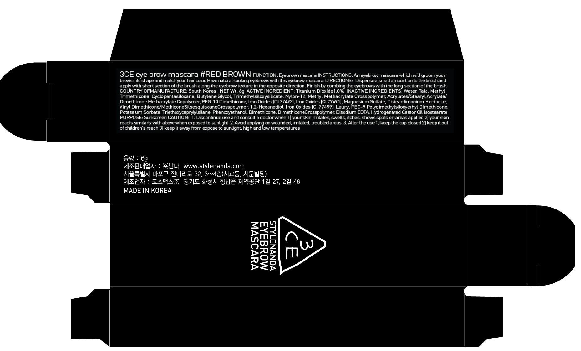 The 3CE Eyebrow mascara in red brown color is a product of South Korea that helps in shaping the eyebrows and complements the hair color. The mascara should be applied in the opposite direction of the eyebrow texture and then combed with the brush. It contains 1% Titanium Dioxide as an active ingredient and other inactive ingredients. The purpose of this mascara is to provide sunscreen protection. It is advised to keep the mascara out of reach of children and avoid applying it to irritated or troubled areas. The text also includes some product codes and a website link.*
