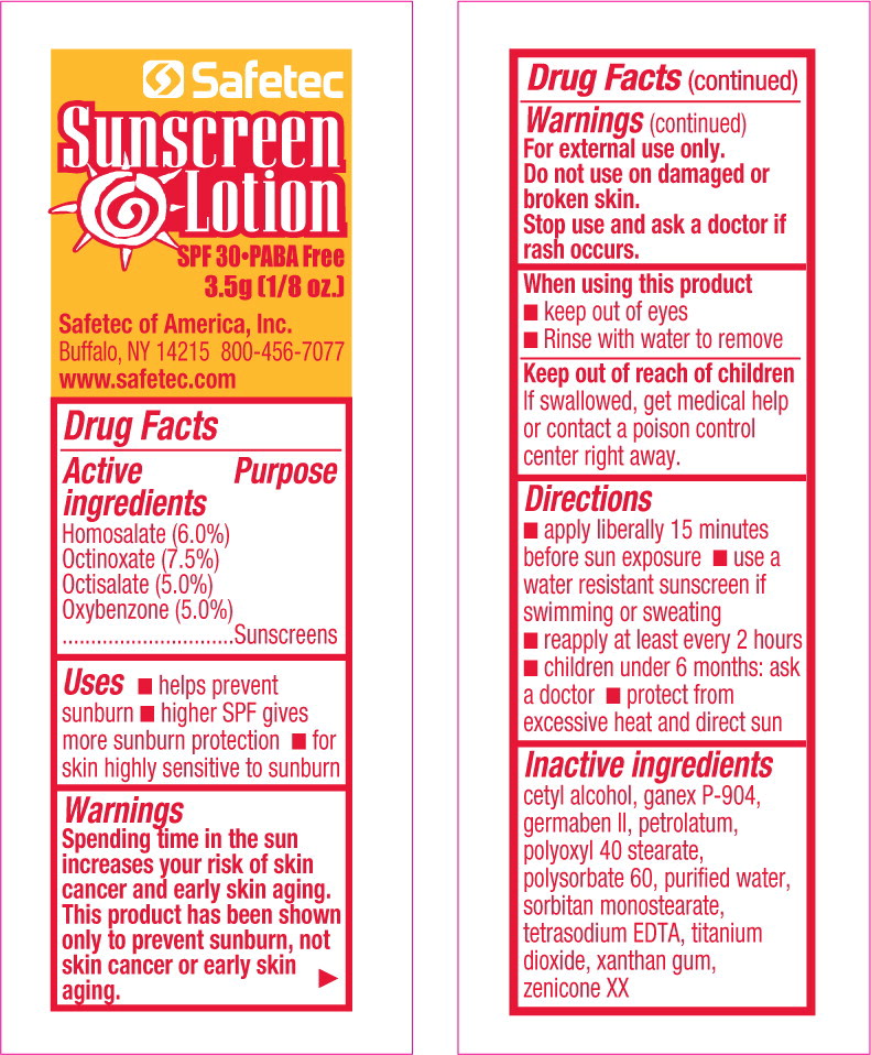 This is a drug facts label for a sunscreen product manufactured by Safetec of America. The product contains four active ingredients that function as sunscreens. The product is designed to prevent sunburn, particularly for individuals with highly sensitive skin. The label warns that the product does not prevent skin cancer or early skin aging. It provides directions for use, including applying the sunscreen at least 15 minutes before sun exposure and reapplying every two hours. Additionally, the label provides a list of inactive ingredients.*