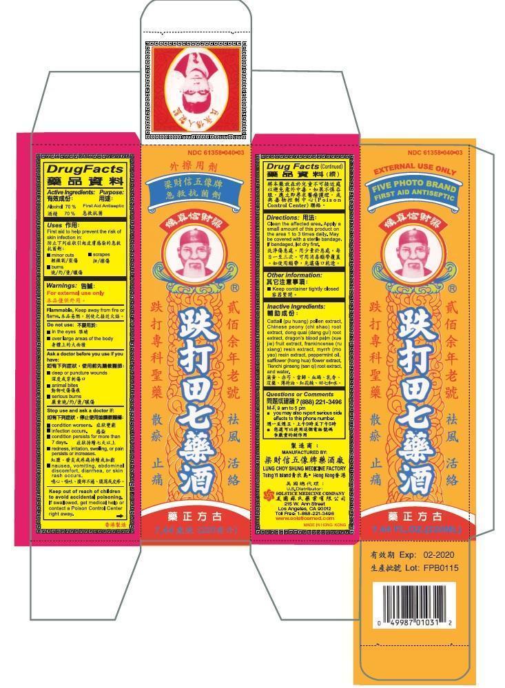 The following image provide visual information about the product associated with Five Photo Brand First Aid Antiseptic NDC 61358-040 by Lung Choy Shung Five Photos Brand Medicine Fty, such as packaging, labeling, and the appearance of the drug itself. This resource could be helpful for medical professionals, pharmacists, and patients seeking to verify medication information and ensure they have the correct product.