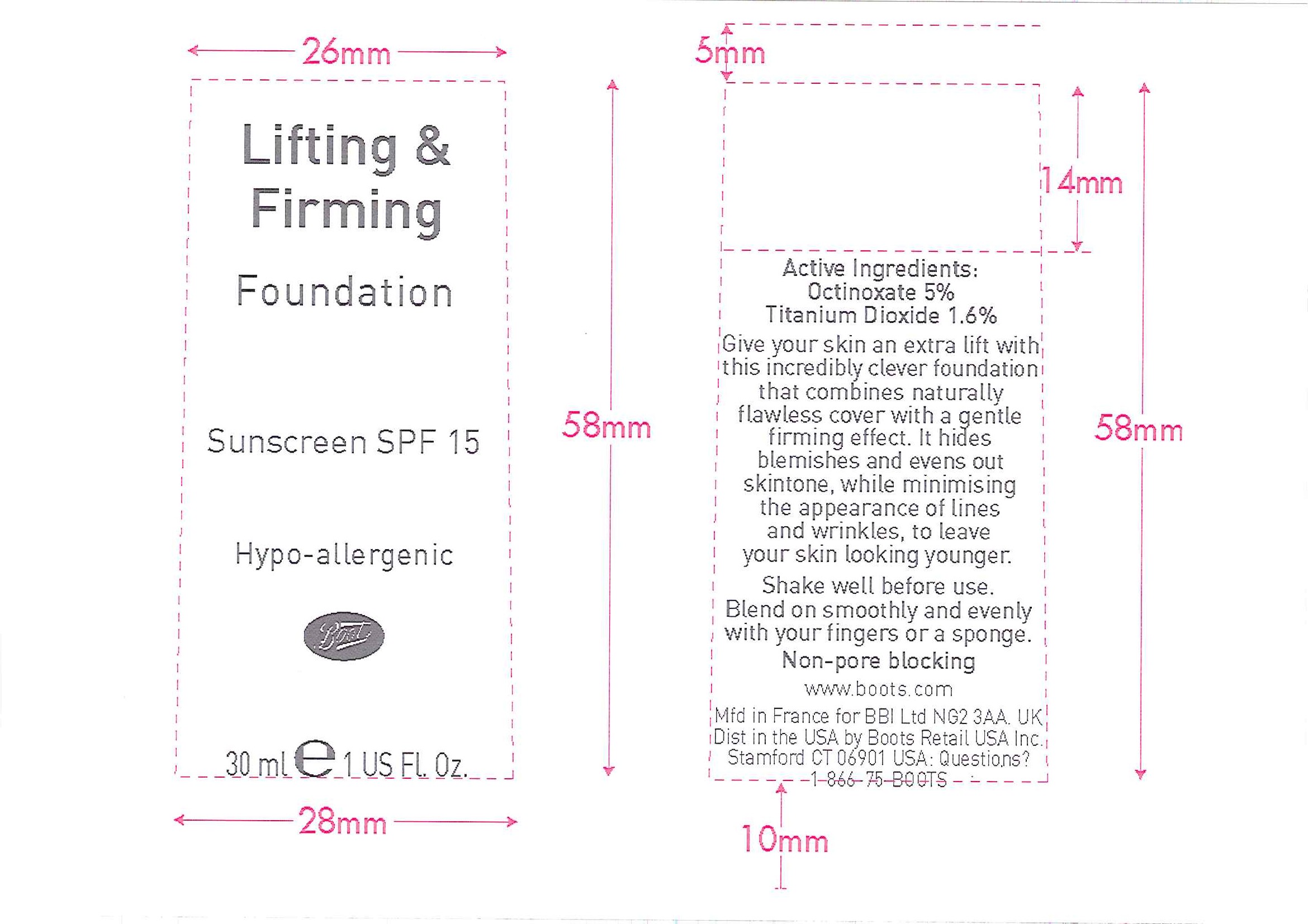 This is a Lifting and Firming Foundation that also functions as a sunscreen with SPF 15. It contains the active ingredients octinoxate and titanium dioxide. The foundation provides a flawless coverage with a gentle firming effect, hiding blemishes and evening out skin tone, while reducing the appearance of lines and wrinkles, to leave your skin looking younger. To use, shake well before applying smoothly and evenly with fingers or a sponge. This foundation is not pore-blocking and is hypo-allergenic. The product is sold by Boots.com and manufactured in France for BBI Ltd NG2 34A UK. It is distributed in the USA by Boots Retail USA Inc. If you have any questions, contact 1-866-F5-BOOTS.*
