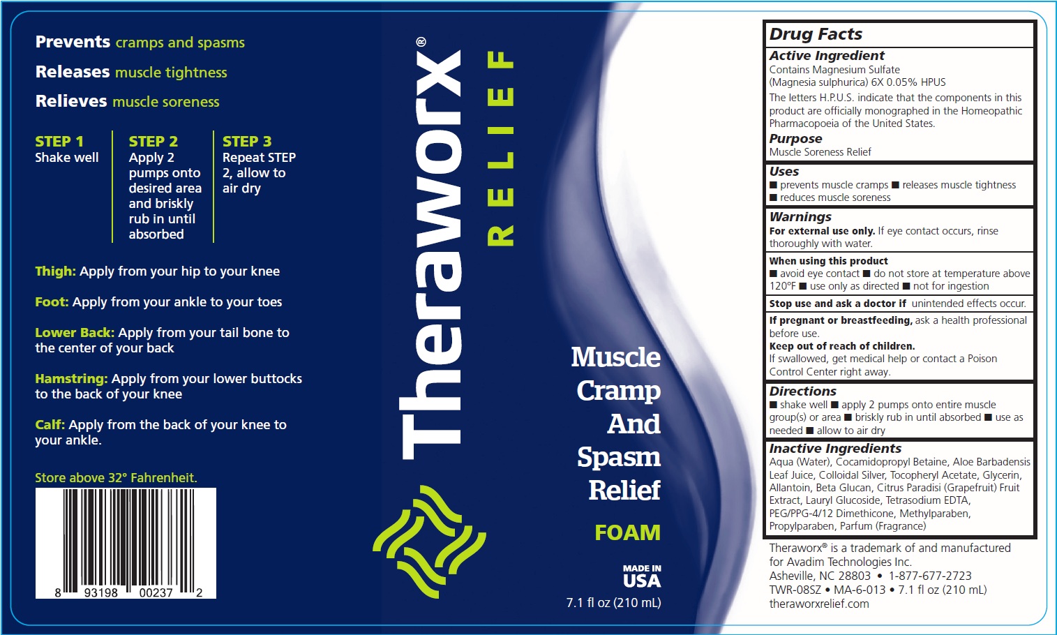 Theraworx Relief Muscle and Spasm Relief Foam is a topical solution used for releasing muscle tightness and relieving muscle soreness. It can be applied to various body parts such as the thigh, foot, lower back, hamstring, and calf by following the three-step application process. This product is meant for external use only and should be kept out of reach of children. It is manufactured by Avadim Technologies Inc. and should be stored at temperatures above 32°Fahrenheit. The Drug Facts label provides further information about the product's components.*