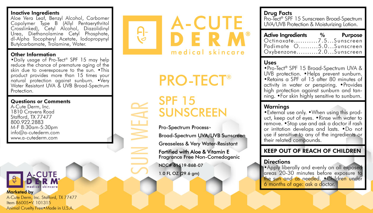 The following image provide visual information about the product associated with Pro-tect Everyday Sunscreen Spf 15 NDC 61619-868 by A-cute Derm, Incorporated, such as packaging, labeling, and the appearance of the drug itself. This resource could be helpful for medical professionals, pharmacists, and patients seeking to verify medication information and ensure they have the correct product.