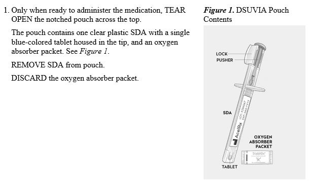 This text provides instructions on how to administer medication from a pouch containing a single blue-colored tablet in a clear plastic SDA (sufentanil sublingual tablet) and an oxygen absorber packet. The user is instructed to tear open the notched pouch, remove the SDA from the pouch, and discard the oxygen absorber packet. Figure 1 shows a depiction of the content in the pouch.*