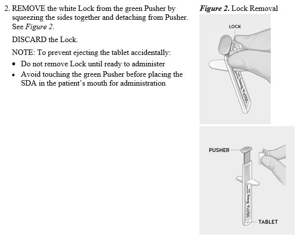 This text provides instructions for removing a white lock from a green pusher, as illustrated in Figure 2. After removing the lock, the user should discard it and take care not to accidentally eject the tablet. The text also cautions against touching the green pusher before administering the tablet to the patient. Overall, this text seems to be part of a set of instructions for administering medication.*