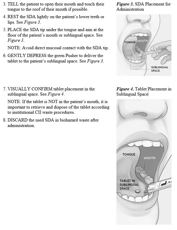 This text provides a step-by-step guide for administering medication using a sublingual drug applicator (SDA). The instructions include asking the patient to touch their tongue to the roof of their mouth, resting the SDA on the patient's lower teeth or lips, placing the SDA tip under the tongue, depressing the pusher to deliver the tablet to the sublingual space, visually confirming tablet placement, and discarding the used SDA in biohazard waste after administration. The text also includes figures to illustrate SDA placement for administration and tablet placement in the sublingual space.*
