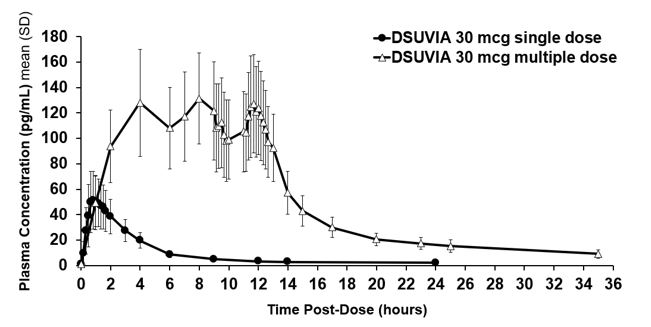 The text describes a graph that shows plasma concentration (measured in pg/mL) over time (up to 36 hours) after administering DSUVIA at a single dose of 30 mcg or multiple doses, represented by mean values and standard deviations.*