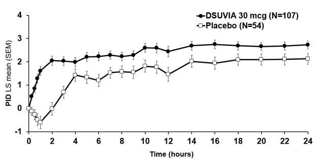 This text appears to be a graph showing the LS mean (SEM) for PID, with DSUVIA 30 mcg and placebo as the variables along the x-axis (represented at the bottom by time in hours) and the y-axis representing the values of LS mean. However, without a visual aid, it is difficult to fully assess the data shown.*