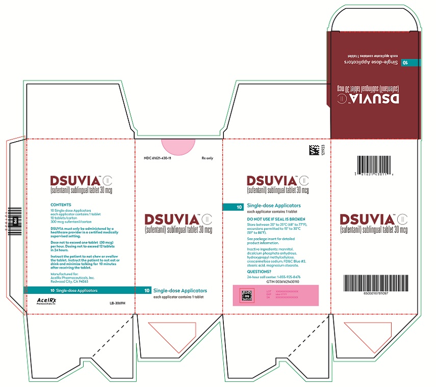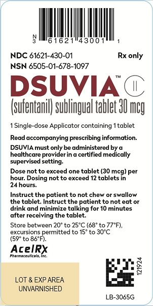 The following 11 images provide visual information about the product associated with Dsuvia NDC 61621-430 by Acelrx Pharmaceuticals, Inc., such as packaging, labeling, and the appearance of the drug itself. This resource could be helpful for medical professionals, pharmacists, and patients seeking to verify medication information and ensure they have the correct product.