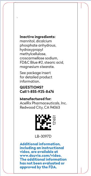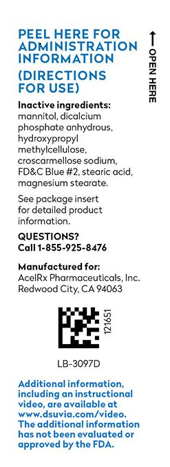 Inactive ingredients in a medication include mannitol, dicalcium phosphate anhydrous, hydroxypropyl methylcellulose, croscarmeliose sodium, FDEC Blue #2, stearic acid, and magnesium stearate. The product is made by AcelRx Pharmaceuticals, Inc. and more information can be found on the package insert or by visiting www.dsuvia.com/video. If there are any questions, contact 1-855.925-8476. The additional information has not been approved by the FDA.*