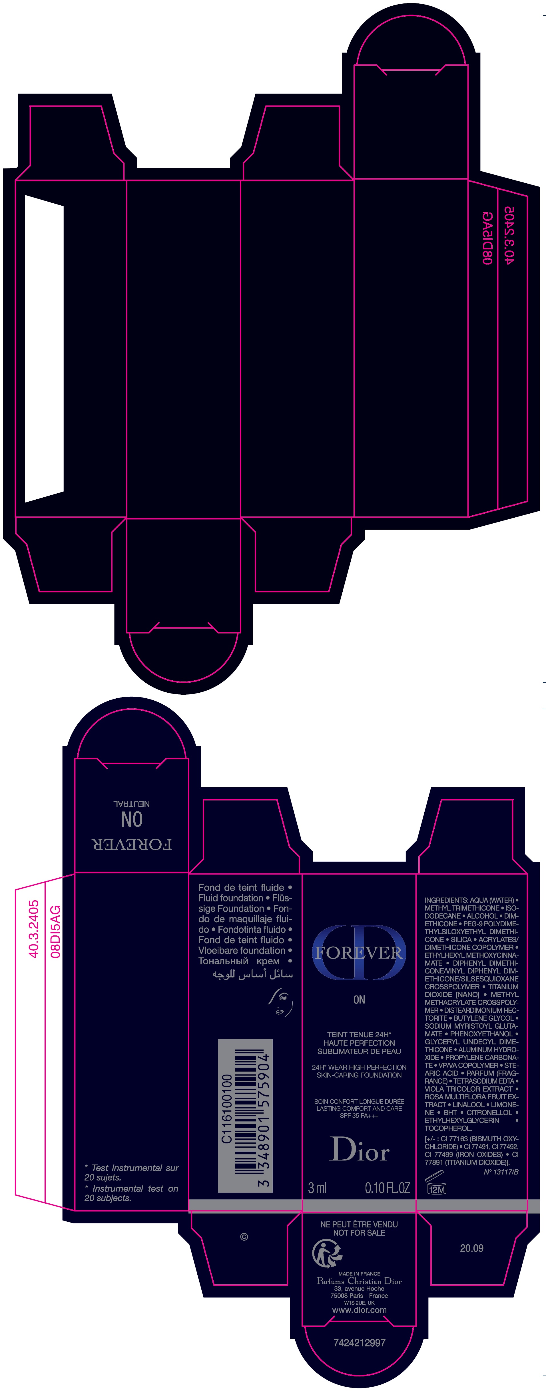 The following 3 images provide visual information about the product associated with Forever 24h Wear High Perfection Skin Caring Foundation With Sunscreen Broad Spectrum Spf 35 Lasting Comfort And Care 0N NDC 61957-2951 by Parfums Christian Dior, such as packaging, labeling, and the appearance of the drug itself. This resource could be helpful for medical professionals, pharmacists, and patients seeking to verify medication information and ensure they have the correct product.