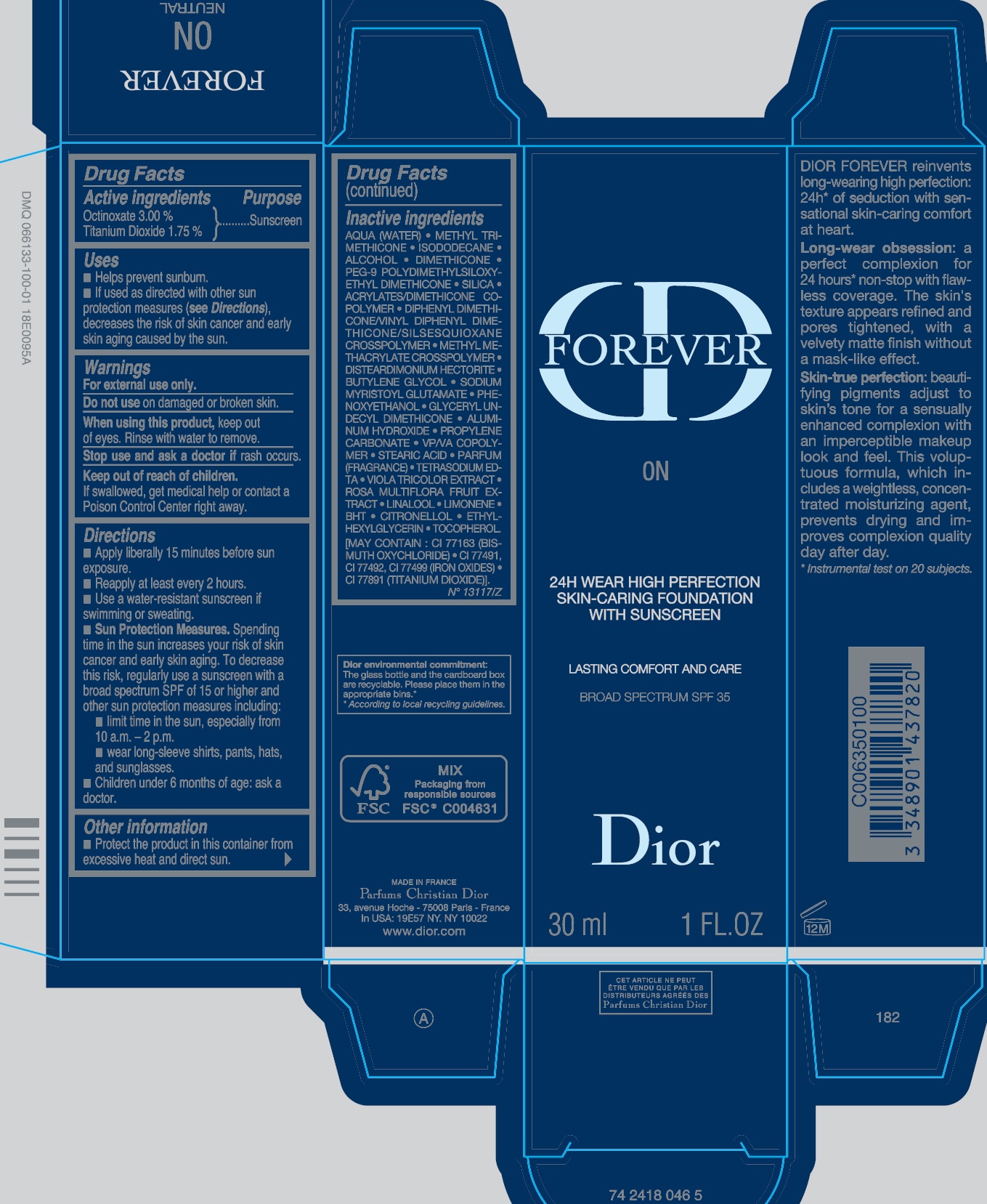 This is a drug facts label for a sunscreen product containing Octinoxate and Titanium Dioxide. The sunscreen is meant to decrease the risk of skin cancer and early skin aging if used as directed, and it is a broad-spectrum SPF 35 sunscreen. The inactive ingredients include a mix of synthetic and natural substances. The packaging is made from recyclable materials, and the product is made in France by Parfums Christian Dior. The sunscreen is meant for external use only and should not be applied to damaged or broken skin. It should be reapplied every two hours and used in combination with other sun protection measures. The sunscreen should be kept out of reach of children and protected from excessive heat and direct sun.*
