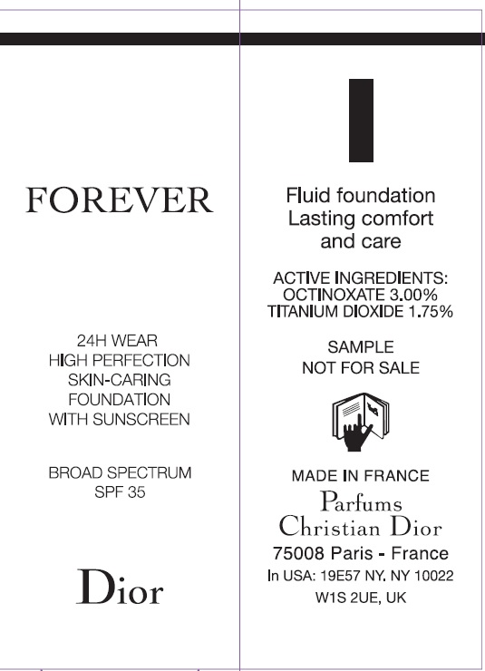 This is a description of Dior's Forever foundation, which promises 24-hour wear, high perfection, skin-caring, and SPF 35 broad-spectrum sunscreen protection. It is a fluid foundation that provides lasting comfort and care, and contains active ingredients such as OCTINOXATE 3.00% and TITANIUM DIOXIDE 1.75% for sun protection. It is made in France and the sample is not for sale.*
