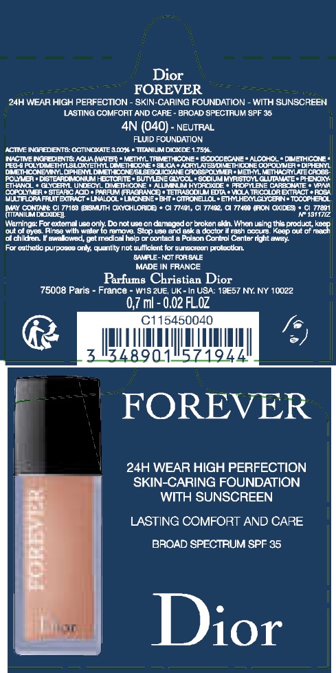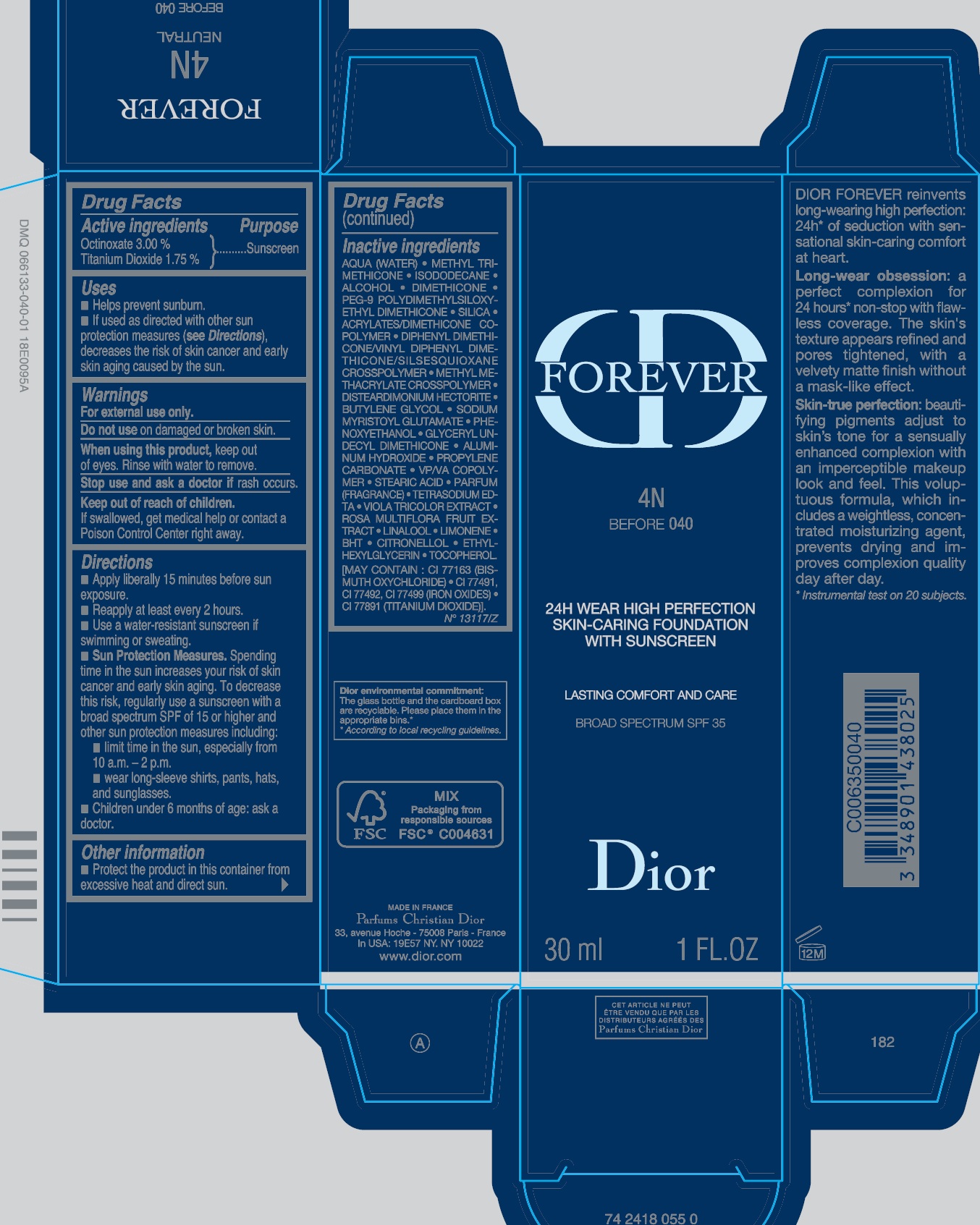 Dior Forever 24H Wear High Perfection is a fluid foundation with neutral color 4N (040), containing sunscreen SPF 35 and skin-caring ingredients. It provides lasting comfort and care for the skin, and is made in France by Parfums Christian Dior. The text also warns not to use a damaged or broken product, and that the quantity provided is not sufficient for sunscreen protection.*