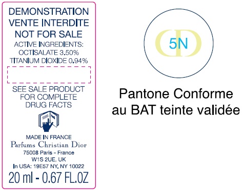 This is a description of a demonstration product which is not for sale and contains active ingredients like Octisalate and Titanium Dioxide. It instructs readers to see the sale product for complete drug facts. It has a reference to Christian Dior Paris and is available in 20 ml. There are also addresses for the UK and USA listed. Additionally, it mentions that the product is Pantone compliant based on a validated color.*
