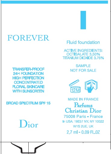 Forever is a fluid foundation made in France that provides high perfection and has a floral skincare formula with sunscreen. The foundation has broad spectrum SPF 15 protection and contains 3.50% Octisalate and 3.76% Titanium Dioxide. It is a concentrated Z2 formula that is transfer-proof and comes in a 2.7ml/0.09fl oz sample size. The foundation is not for sale and is a 24+ hour formula. However, the rest of the text is not available.*
