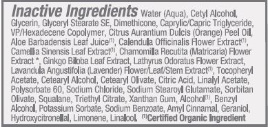 This is a list of inactive ingredients found in a cosmetic or skincare product. It includes water, various plant extracts such as orange peel, aloe vera, calendula, chamomile, ginkgo biloba, and lavender, as well as other typical cosmetic ingredients like glycerin, dimethicone, and polysorbate 60. The product also contains some alcohol, and preservatives like benzyl alcohol, potassium sorbate, and sodium benzoate. All of the ingredients are certified organic.*