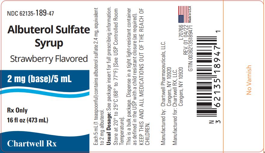 This is a medication called Albuterol Sulfate Syrup which comes in a 4fl oz (120 mL) container with a Strawberry flavor. It has the NDC code 62135-189-41 and is only available with a prescription (Rx Only). The manufacturer is Chartwell Rx and the medication is USP Confirmed. It is important to store the medication in a safe place out of the reach of children.*