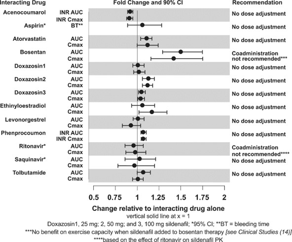 This text provides information on drug interactions and recommendations for dosage adjustments based on the fold change and 90% confidence interval (CI). It includes a list of drugs such as Acenocoumarol, Aspirin, Atorvastatin, Bosentan, Doxazosin, Ethinylestradiol, Levonorgestrel, Phenprocoumon, Ritonavir, Saquinavir, and Tolbutamide. Dosage adjustments are classified as no dose adjustment needed, coadministration, or not recommended. The text also mentions the lack of benefit on exercise capacity when sildenafil is added to bosentan therapy.*