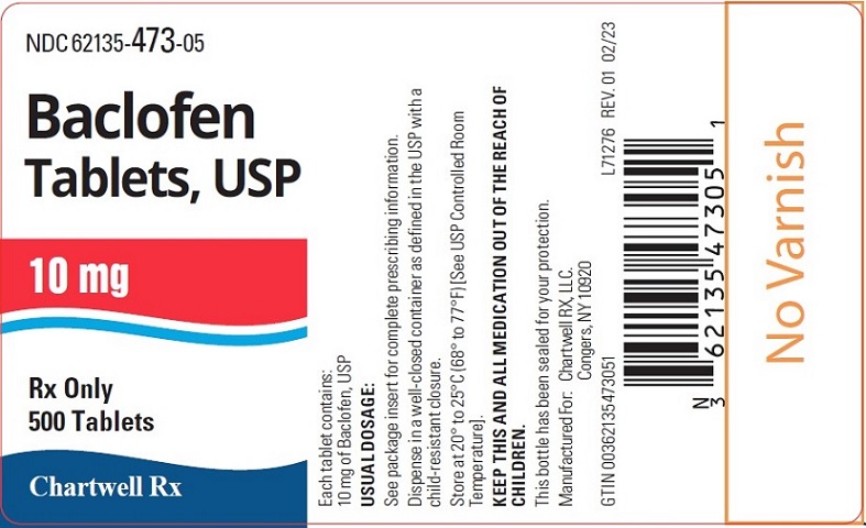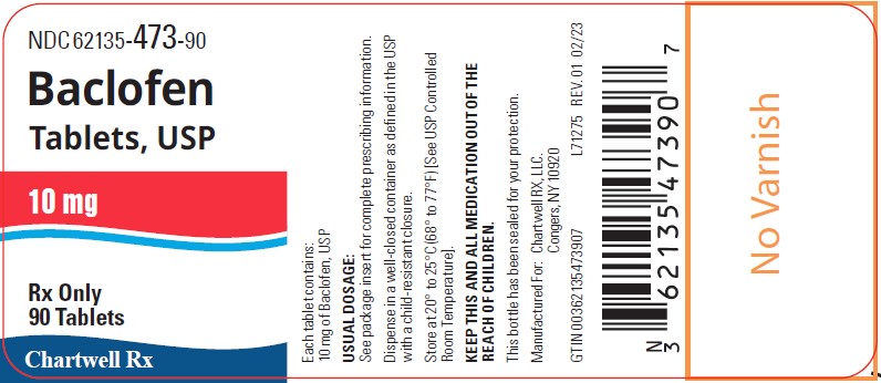 The following 6 images provide visual information about the product associated with Baclofen NDC 62135-473 by Chartwell Rx, Llc, such as packaging, labeling, and the appearance of the drug itself. This resource could be helpful for medical professionals, pharmacists, and patients seeking to verify medication information and ensure they have the correct product.