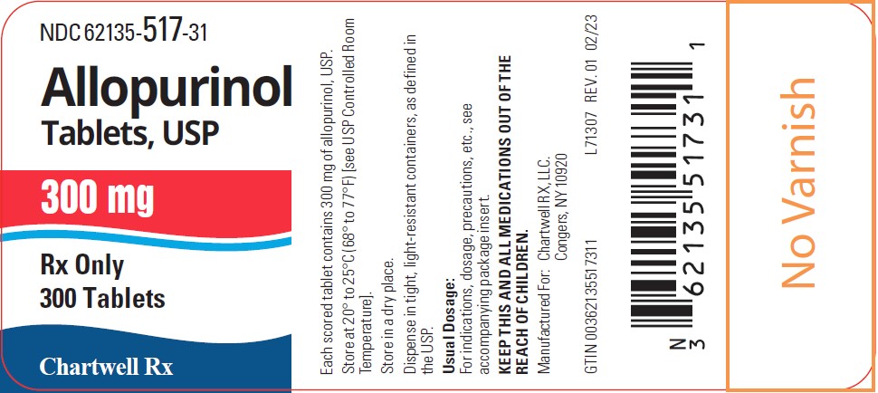 This is a product label for Allopurinol Tablets, USP with NDC number 62135-517-90. The pack contains 90 tablets and is only available with a prescription. The product is manufactured for Chartwell Rx and comes in child-resistant packaging. The label also includes a revision number and manufacture date.*