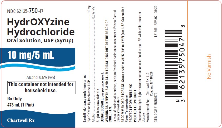 The following 2 images provide visual information about the product associated with Hydroxyzine Hydrochloride NDC 62135-750 by Chartwell Rx, Llc, such as packaging, labeling, and the appearance of the drug itself. This resource could be helpful for medical professionals, pharmacists, and patients seeking to verify medication information and ensure they have the correct product.