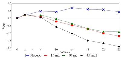 The dose can be titrated in increments of 15 mg up to a maximum of 45 mg once daily based on glycemic response as determined by HbA1c.