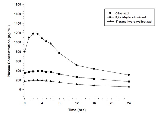 Pharmacokinetics are approximately dose proportional. Cilostazol and its active metabolites have apparent elimination half-lives of about 11 to 13 hours. Cilostazol and its active metabolites accumulate about 2-fold with chronic administration and reach steady state blood levels within a few days. The pharmacokinetics of cilostazol and its two major active metabolites were similar in healthy subjects and patients with intermittent claudication due to peripheral arterial disease (PAD). Figure 1 shows the mean plasma concentration-time profile at steady state after multiple dosing of cilostazol 100 mg twice daily.