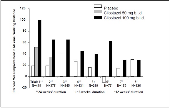 Across the eight clinical trials, the range of improvement in maximal walking distance in patients treated with cilostazol 100 mg twice daily, expressed as the change from baseline, was 28% to 100%.