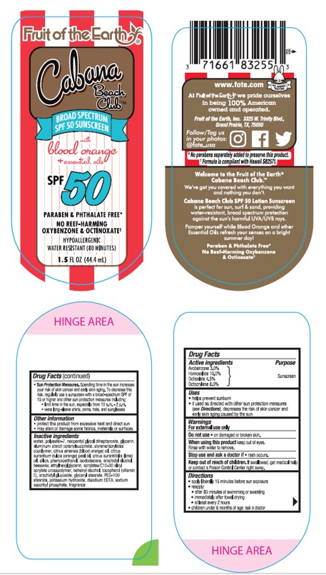 The following 2 images provide visual information about the product associated with Cabana Beach Club With Blood Orange And Essential Oils Spf 50 Sunscreen NDC 62217-247 by Fruit Of The Earth, Inc., such as packaging, labeling, and the appearance of the drug itself. This resource could be helpful for medical professionals, pharmacists, and patients seeking to verify medication information and ensure they have the correct product.