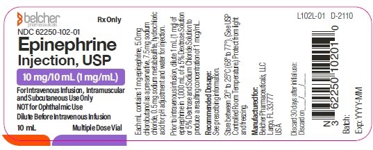 The following 3 images provide visual information about the product associated with Epinephrine NDC 62250-102 by Belcher Pharmaceuticals, Llc, such as packaging, labeling, and the appearance of the drug itself. This resource could be helpful for medical professionals, pharmacists, and patients seeking to verify medication information and ensure they have the correct product.