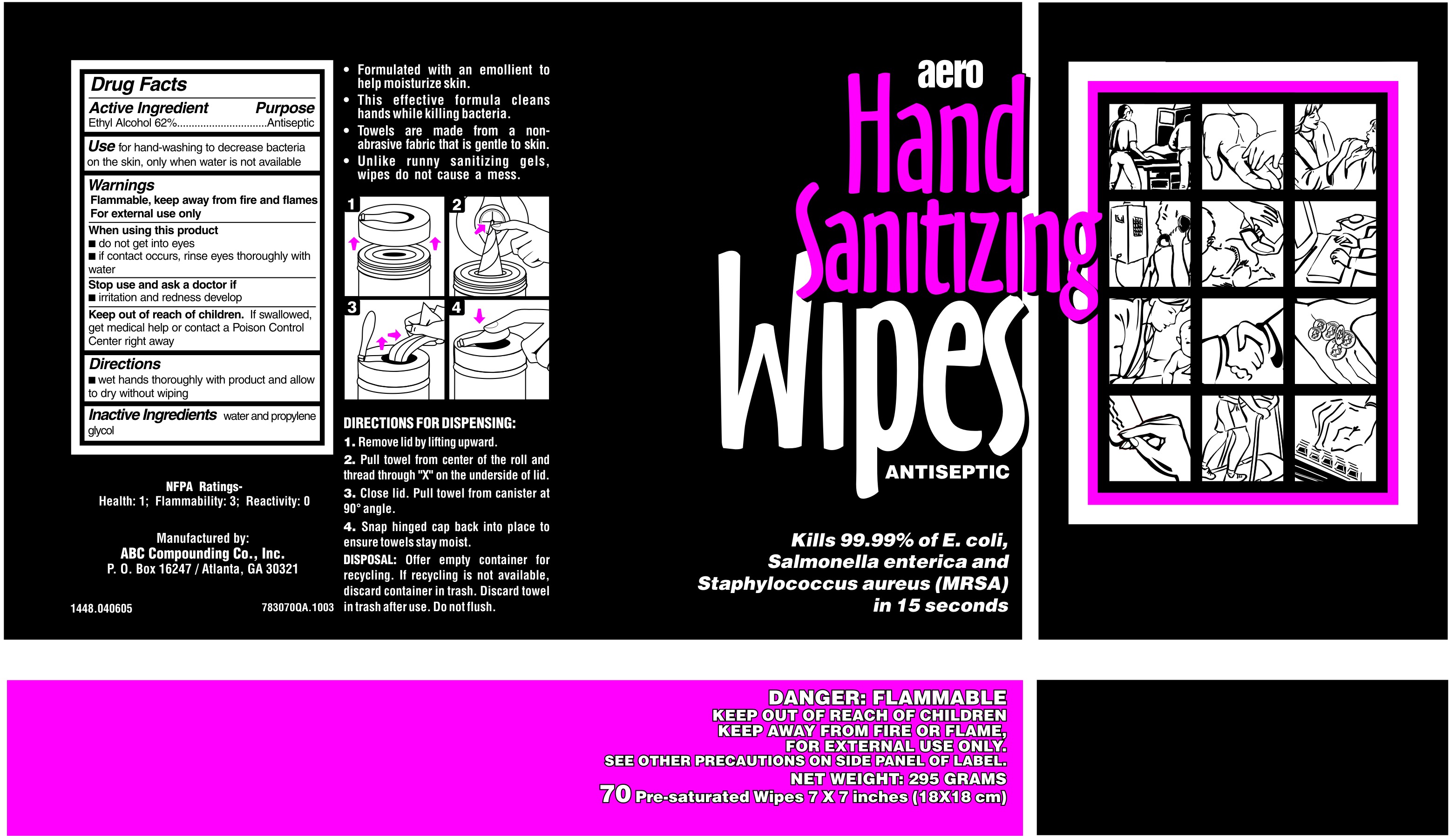 The following image provide visual information about the product associated with Hand Sanitizing Wipes NDC 62257-830 by Abc Compounding Co., Inc., such as packaging, labeling, and the appearance of the drug itself. This resource could be helpful for medical professionals, pharmacists, and patients seeking to verify medication information and ensure they have the correct product.