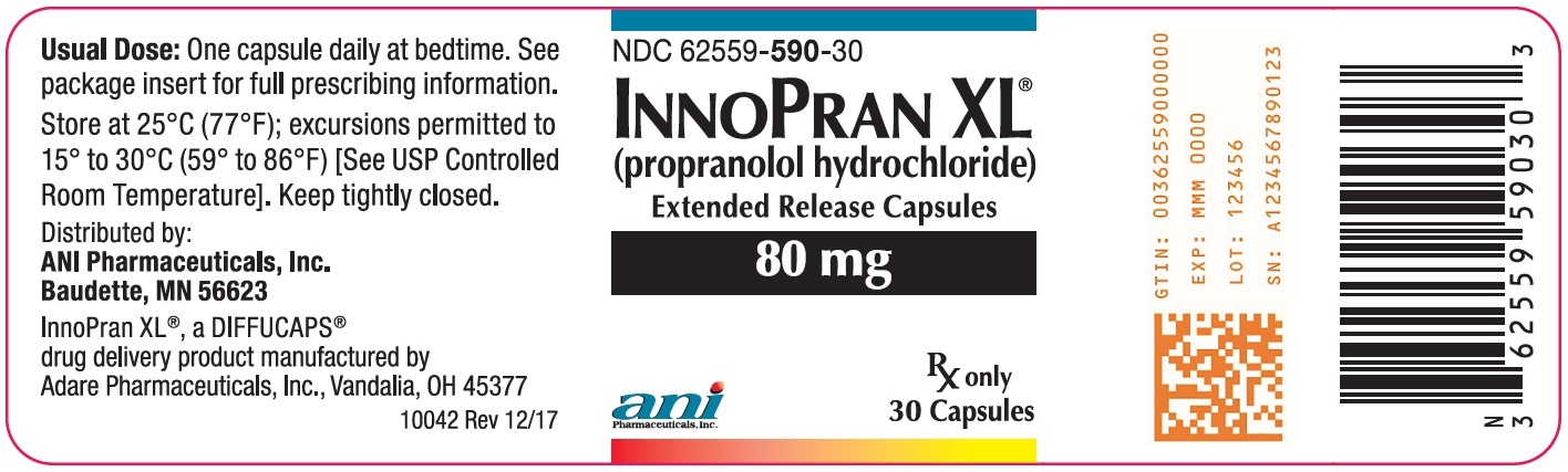 80 mg: A gray/white capsule, imprinted with ‘InnoPran XL’, ‘80’, and 2 segmented bands, is available in bottles of 30 capsules (NDC 62559-590-30) and professional samples of 7 capsules (NDC 62559-590-77).