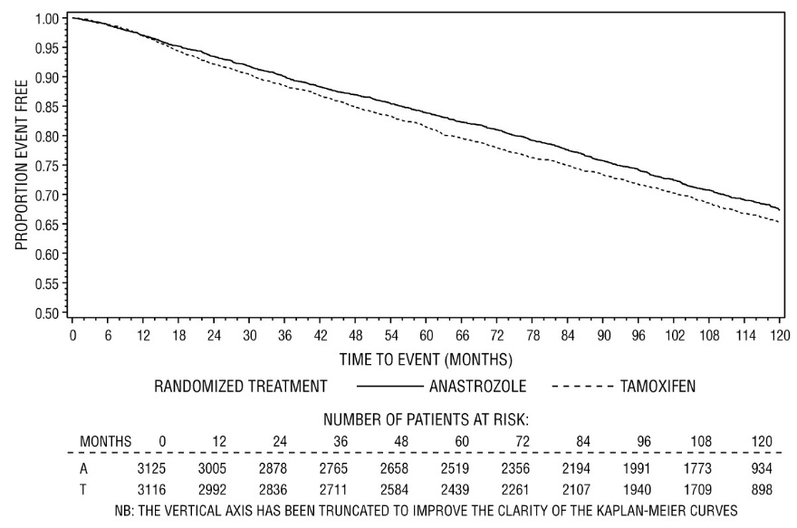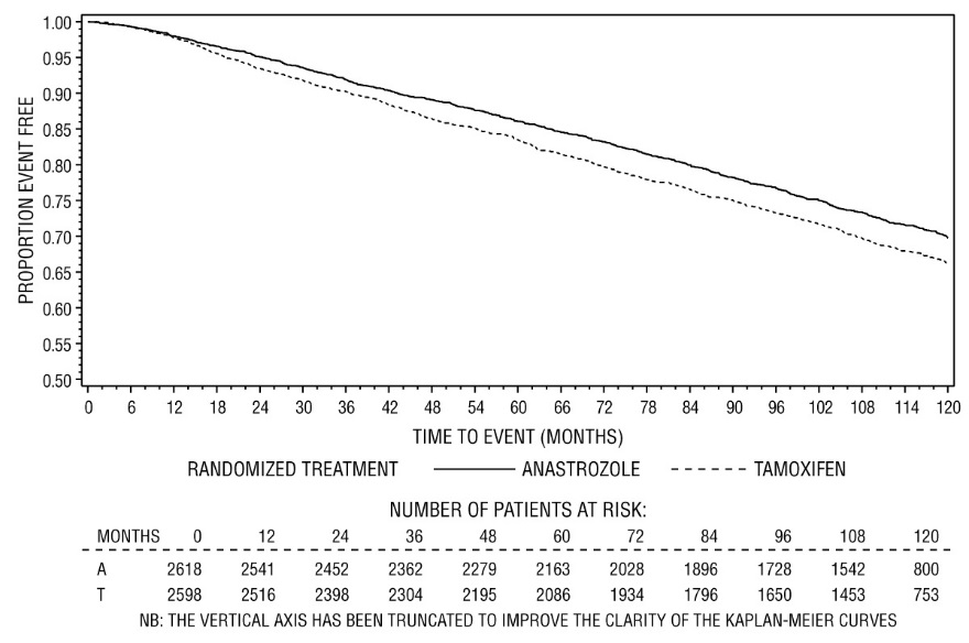 This is a graph showing the proportion of patients event-free over time to the event (in months) while being treated with randomized treatment of Anastrozole or Tamoxifen. The number of patients at risk is shown on the horizontal axis. The vertical axis has been truncated to improve the clarity of the Kaplan-Meier curves.*