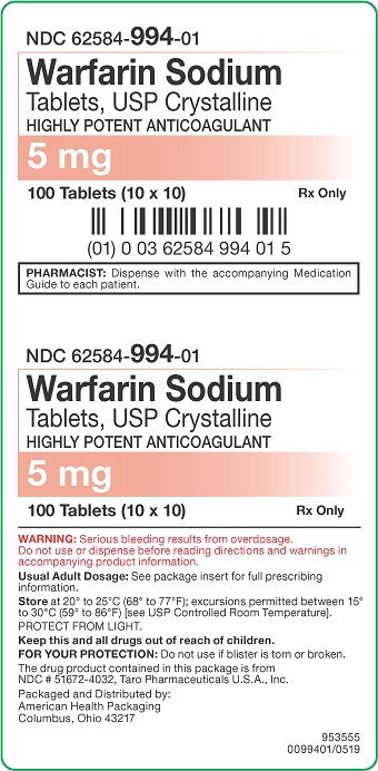 This is a description of a medication with the NDC code 62584-994-01. The medication is Warfarin Sodium and comes in a package containing 100 tablets (10 x 10). It is a highly potent anticoagulant and the usual adult dosage can be found on the package insert or prescribing information. It should be stored at temperatures between 20° to 25°C (58°F to 77°F) and protected from light. The drug should be kept out of reach of children and not used if the packaging is damaged. The medication is from NG # S1672-4535, Taro Pharmaceuticals and packaged/distributed by American Health Packaging in Columbus, Ohio.*