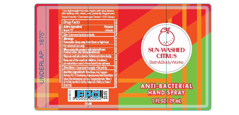 The following image provide visual information about the product associated with Anti-bacterialhandspray Sun Washed Citrus NDC 62670-6796 by Bath & Body Works, Inc., such as packaging, labeling, and the appearance of the drug itself. This resource could be helpful for medical professionals, pharmacists, and patients seeking to verify medication information and ensure they have the correct product.