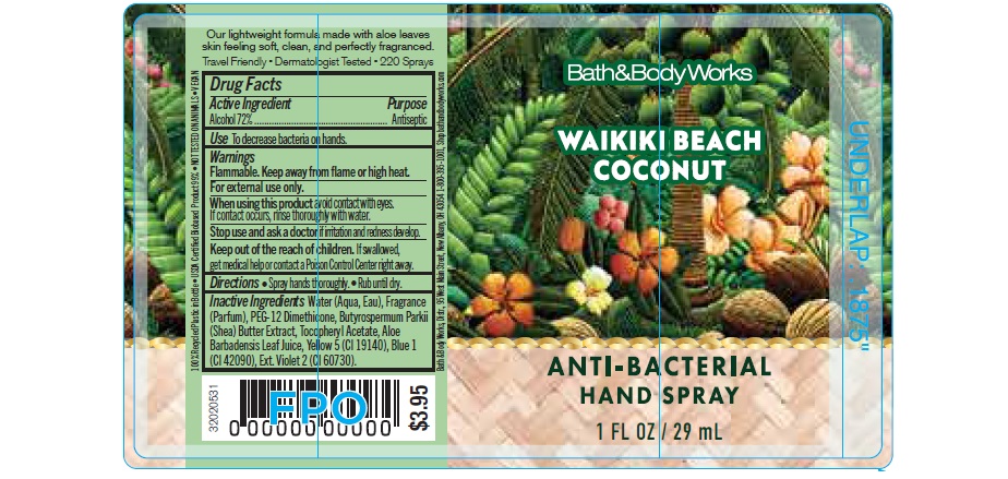 The following image provide visual information about the product associated with Anti-bacterialhandspray Waikiki Beach Coconut NDC 62670-6886 by Bath & Body Works, Inc., such as packaging, labeling, and the appearance of the drug itself. This resource could be helpful for medical professionals, pharmacists, and patients seeking to verify medication information and ensure they have the correct product.