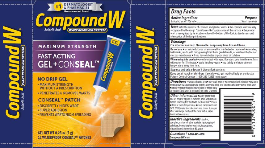 Compound W Maximum Strength Fast Acting No Drip Gel is a wart remover system that penetrates and removes warts without a prescription. The product comes with 12 waterproof CONSEALâ„¢ patches that discretely hide the wart and prevent it from spreading. The gel has super adhesion and is easy to apply. Each package contains 0.252 oz (7 g) of gel.*