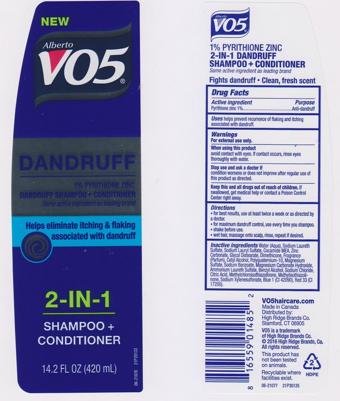 This is a drug facts label for a 2-in-1 dandruff shampoo and conditioner that contains 1% Pyrithione Zinc as an active ingredient. It is designed to prevent the recurrence of dandruff and associated itching and flaking. The label provides directions for use, warnings, and precautions. It is manufactured by High Ridge Brands and is available in a 14.2 FL OZ (420 mL) recyclable package.*