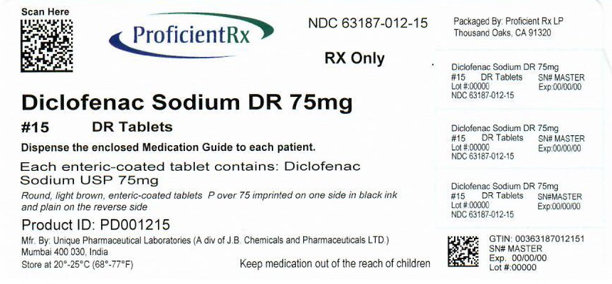 Diclofenac sodium is a prescription-only medication available in the form of enteric-coated round light brown tablets with P over 75 marked on one side in black ink and plain on the reverse side. Each tablet contains sodium USP 75 mg. It is produced by Unique Pharmaceutical Laboratories, a division of J.B. Chemicals and Pharmaceuticals Ltd, and packaged by ProficientRx, Thousand Oaks, CA. The tablets are sold in a packet of 15 with medication guidelines enclosed, and are identified by a product ID of PD001215, lot numbers 0000 (Exp000000), NDC 63187-012-15, and a GTIN of 0363187012151. The tablets should be kept out of the reach of children and stored at a temperature between 20°-25°C (68°-77°F).*