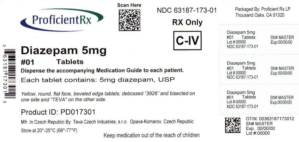 This is a description of Diazepam 5mg tablets packaged by ProficientRx LP. The medication is indicated for prescription only and comes with a Medication Guide. Each tablet contains 5mg diazepam, USP and is round and yellow with "3926" and bisected on one side and "TEVA" on the other. The lot number is 00000 with an expiration date of 00/00/00. The National Drug Code (NDC) is 63187-173-01, identifying the product with the Product ID: PD017301 and GTIN: 00363187173012. The manufacturer is Teva Czech Industries, s.r.o in Czech Republic. It is advised to store the medication at 20°-25°C (68°-77°F) and keep it out of the reach of children.*
