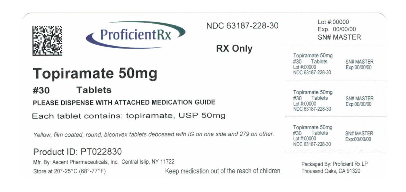 This is a medication called Topiramate 50mg with NDC number 63187-228-30, which comes in a pack of 30 tablets. The tablets are yellow, round, and film-coated, with IG and 279 imprinted on each side. The medication guide should be dispensed with the tablets. The lot number is 00000, and the expiry date is 00/00/00. The medication should be stored at room temperature, between 20°-25°C, and kept out of reach of children. It is manufactured by Ascent Pharmaceuticals and packaged by Proficient Rx LP in Thousand Oaks, CA.*